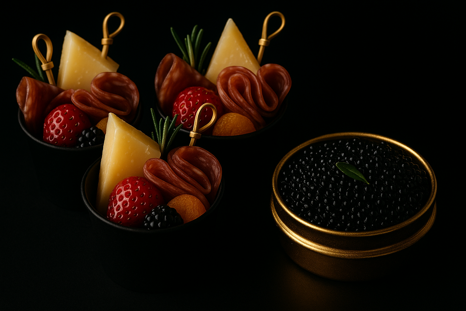 Our most elevated offering — the Luxe Graze Bundle includes both our signature Charcuterie Cup Catering Package and Caviar Blini Package, designed to impress at your most special events. Premium cheeses, artisan accompaniments, and delicate black caviar blinis — beautifully curated for effortless, luxurious entertaining.